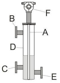 圖中 E 所示為排污法蘭,可定期將液位測控儀內(nèi)污物對外排放,保持液位測控儀測量表筒內(nèi)清潔干凈,避免傳感器粘附污物。